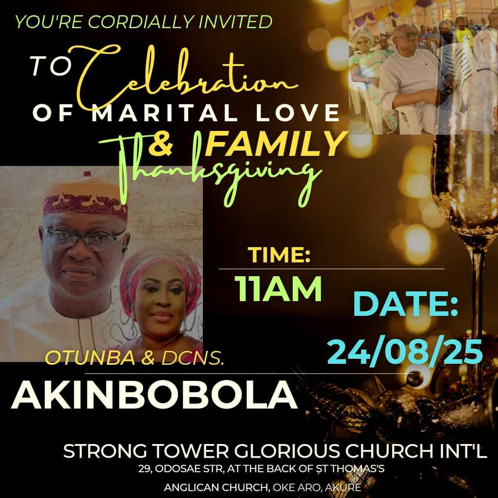 All is now set for a grand and joyous occasion in Akure, as the Chairman of Egbe Atunluse Initiatives, Otunba Akin Akinbobola, and his beloved wife, Deaconess Akinbobola, prepare to celebrate their Marital Love and Family Thanksgiving. The much-anticipated event will hold on Sunday, 24th August 2025, at the Strong Tower Glorious Church International, Akure, Ondo State.....